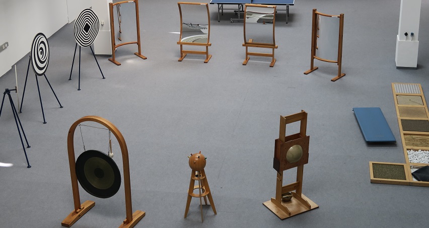 Für den Aufbau der Ausstellung ist eine Gesamtfläche von mindestens 100 m2 in einem abgeschlossenen Raum erorderlich. Das SinnenFeld lebt optisch davon, dass die Objekte nicht zu eng aufeinander gestellt werden. Akustisch gilt es zu bedenken, dass z. B. Summkugel und Gong in ausreichendem Abstand stehen.