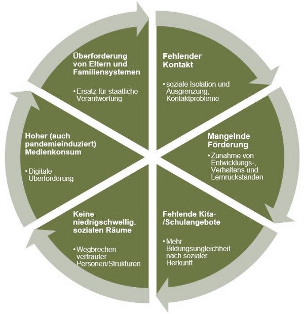 Besonders während der Pandemie hat sich gezeigt, dass Familien, die in Armut leben, besonders stark von den Folgen dieser Krise aufgrund mangelnder Ressourcen und fehlender Unterstützungsstrukturen betroffen sind. Krisen wirken sich auf Kindergesundheit aus: Daten und Erfahrungswissen aus der Pandemie zeigen den dringenden Präventionsbedarf bei Kindern und Jugendlichen im Hinblick auf psychisches Wohlergehen, Ernährung und Bewegung sowie Medienkonsum. Notwendig dafür sind verstärkte Aktivitäten in (non-) formaler Bildung sowie die verstärkte Berücksichtigung der Interessen Jugendlicher sowie benachteiligter Gruppen.