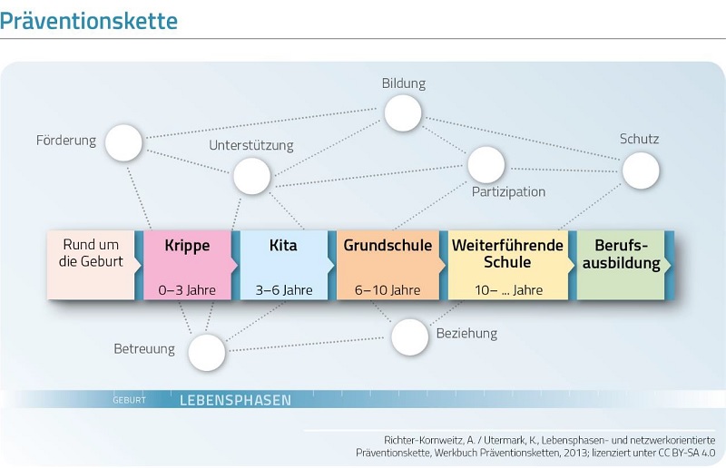 Das Aufwachsen in Wohlergehen braucht umfassende Teilhabechancen: Die materiellen Grundbedürfnisse müssen gesichert, Gesundheitsvorsorge und -förderung gewährleistet sein, soziale Teilhabe sowie Chancengleichheit in der Bildung ermöglicht werden. Einzelkämpfer können das nicht erreichen – so die Quintessenz von Richter-Kornweitz. Die Kommune hat eine Schlüsselrolle zur Entwicklung einer integrierten Gesamtstrategie. Präventionsketten wirken mit Strategie und Struktur gegen das „Präventionsdilemma“, sie setzen als eng geknüpftes Unterstützungssystem strukturell an. Viele gute Angebote sind noch keine Präventionskette! Strategieentwicklung und Strukturaufbau haben Vorrang.