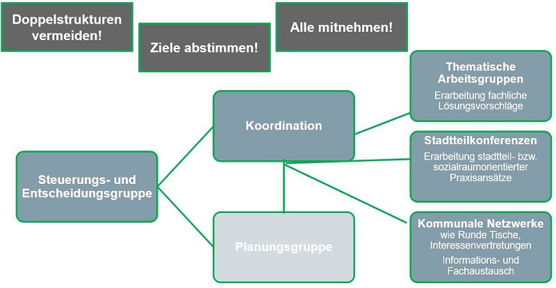 - ressortübergreifend und systematisch zusammenarbeiten – verwaltungsintern und -extern
